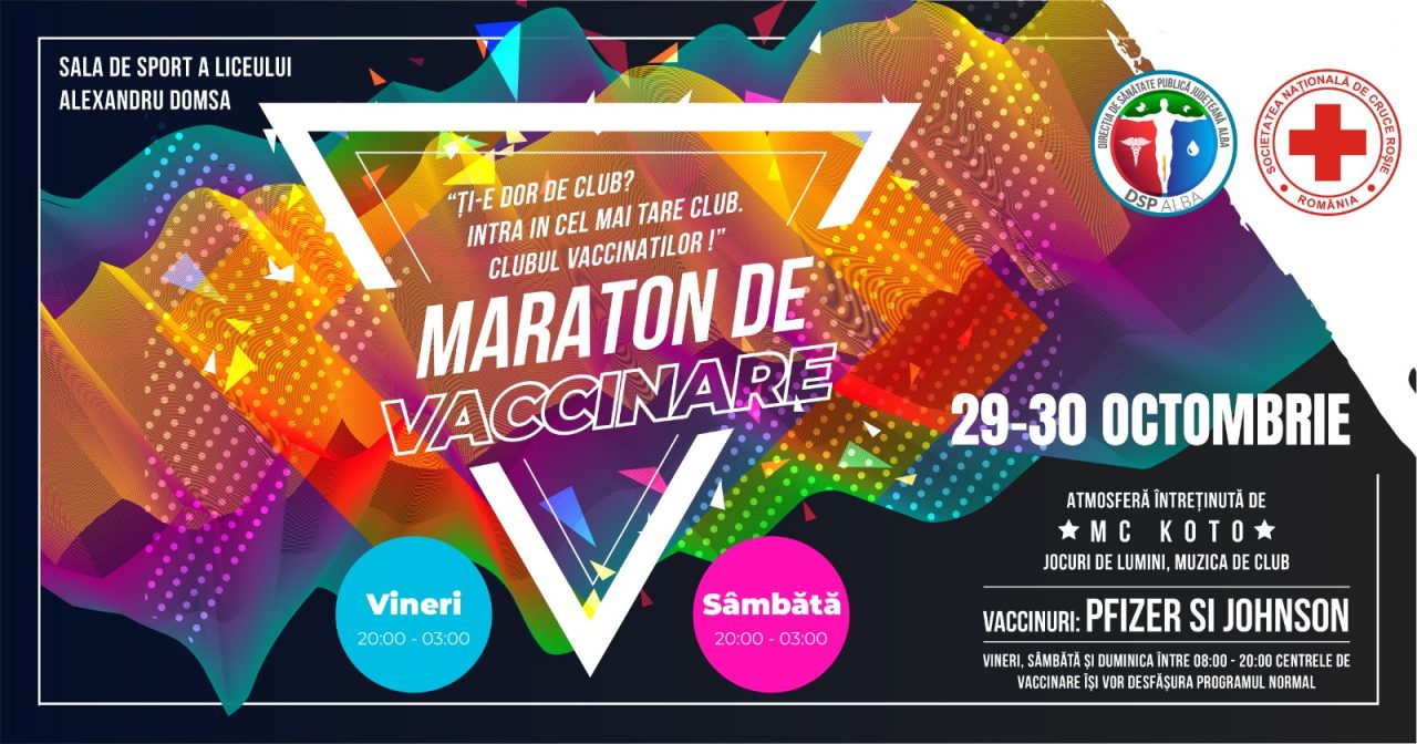 De azi, de la 08:00, până sâmbătă la 15:00, Maraton de vaccinare – Clubul Vaccinaților, organizat de către Direcția de Sănătate Publică Alba la Colegiul Tehnic „Alexandru Domșa”, din Alba Iulia.