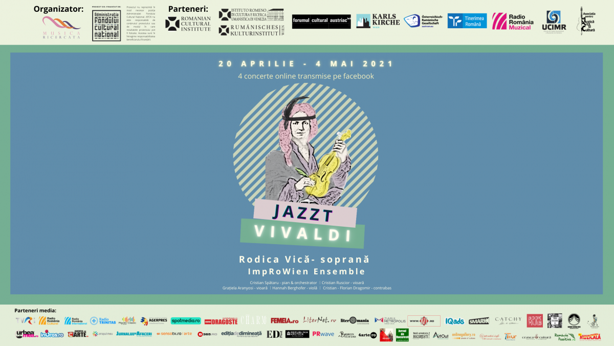 Seria concertelor din cadrul turneului internațional online JAZZT Vivaldi susținute de renumita soprană Rodica VICĂ (România-Austria), alături de ImpRoWien Ensemble (Austria-România): Cristian SPĂTARU pian și orchestrator, Cristian RUSCIOR – vioară 1, Gratiela ARANYOSI – vioară 2, Hannah BERGHOFER – violă și Florian Cristian DRAGOMIR – contrabas, se va desfășura, în perioada 20 aprilie – 4 mai 2021, atât pe pagina de Facebook a Asociației Musica Ricercata: https://www.facebook.com/EnsembleMusicaRicercata, a sopranei Rodica Vică: https://www.facebook.com/rodica.vica, cât și pe paginile de Facebook ale partenerilor implicați în organizarea acestui proiect muzical inedit.