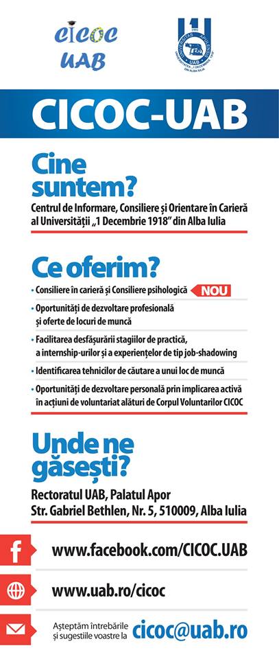 În conformitate cu reglementările Metodologiei privind activităţile de voluntariat desfăşurate în cadrul UAB, studenții interesați de a derula activități de voluntariat la nivelul structurilor Universității sunt așteptați cu CV-ul însoțit de cererea tip de înscriere la sediul administrativ al Centrului de Informare, Consiliere și Orientare în Carieră (Palatul Apor, etajul 1) până în data de 1 noiembrie 2019, zilnic între orele 8.00-16.00.