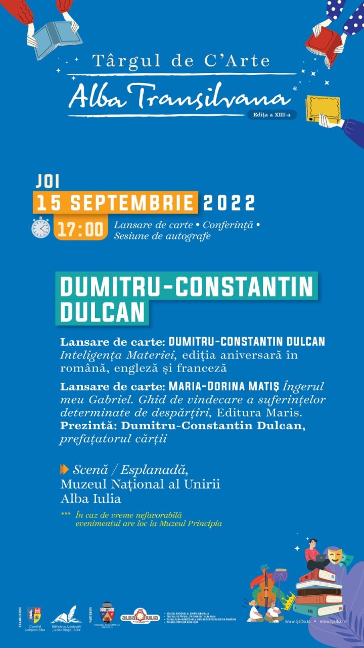 De la ora 17.00 conferențiază Dumitru-Constantin Dulcan, pe tema Viitorul omenirii din perspectivă științifică, ocazie cu care va lansa și volumul Inteligența materiei, ediție aniversară în română, engleză și franceză.