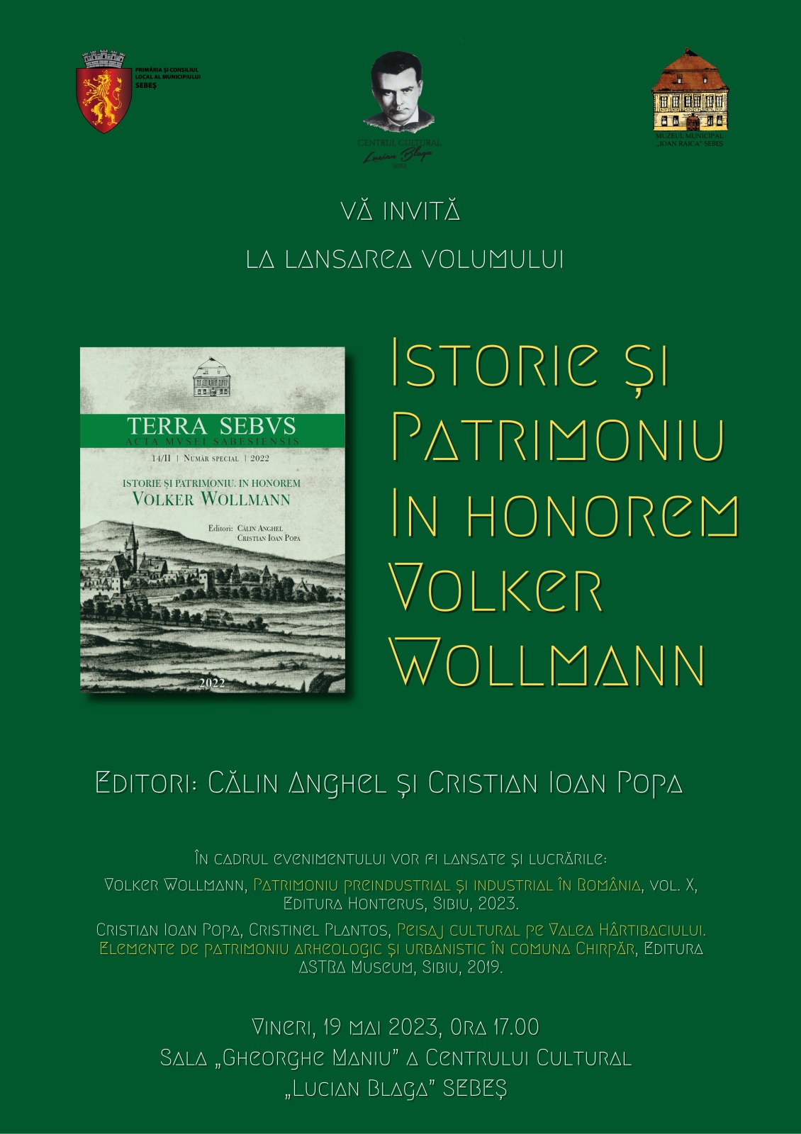 În cadrul aceluiaşi eveniment vor fi lansate și lucrările: Volker Wollmann, „Patrimoniu preindustrial și industrial în România”, vol. X, Editura Honterus, Sibiu, 2023 şi Cristian Ioan Popa, Cristinel Plantos, „Peisaj cultural pe Valea Hârtibaciului. Elemente de patrimoniu arheologic și urbanistic în comuna Chirpăr”, Editura ASTRA Museum, Sibiu, 2019.