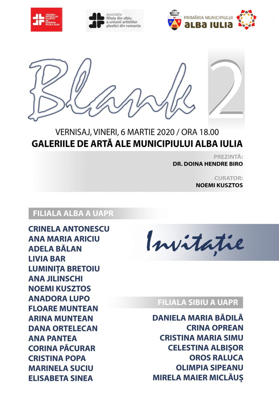 Vineri, 6 martie, Galeriile de Artă ale municipiului Alba Iulia găzduiesc vernisajul expoziţiei „Blank 2”. În cadrul evenimentului vor fi expuse lucrări ale artiștilor Filialelor Alba și Sibiu a UAPR (Uniunea Artiștilor Plastici din România).