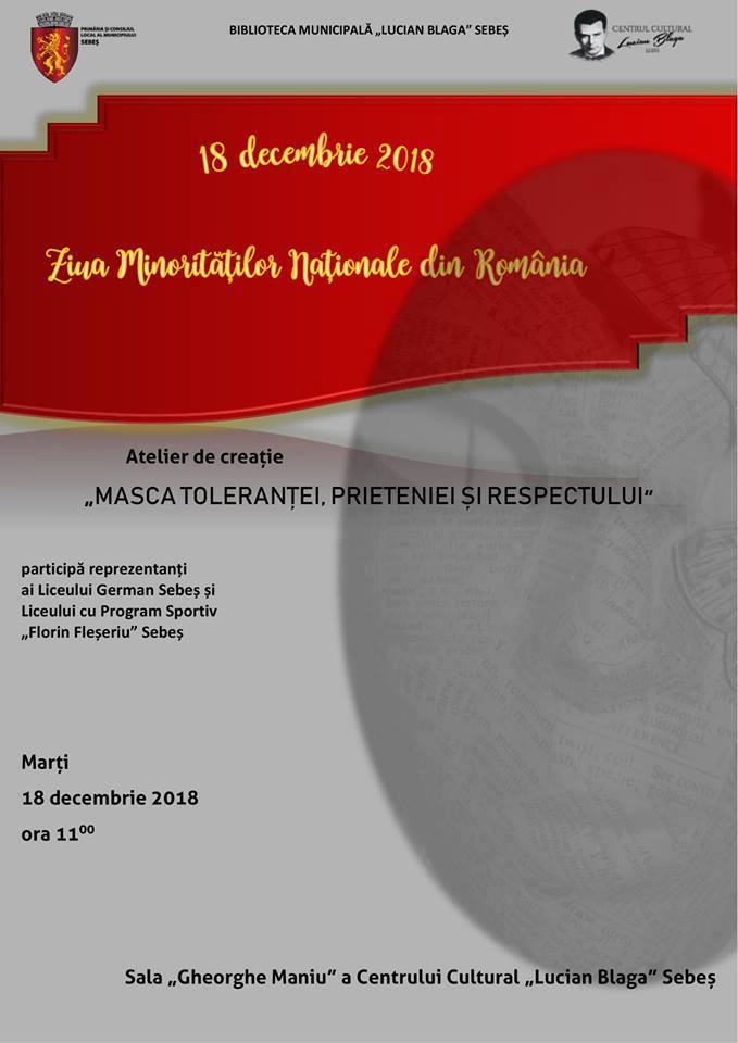 Aceştia vor vizita expoziția de carte „Diversitate și identitate”, organizată la Biblioteca Municipală „Lucian Blagaˮ Sebeș, apoi vor participa la un atelier de creație intitulat „Masca toleranței, prieteniei și respectului”. După prezentarea semnificației și importanței zilei de 18 decembrie, fiecare elev va colora și decupa o mască pe care apoi o va prezenta în cadrul grupului.